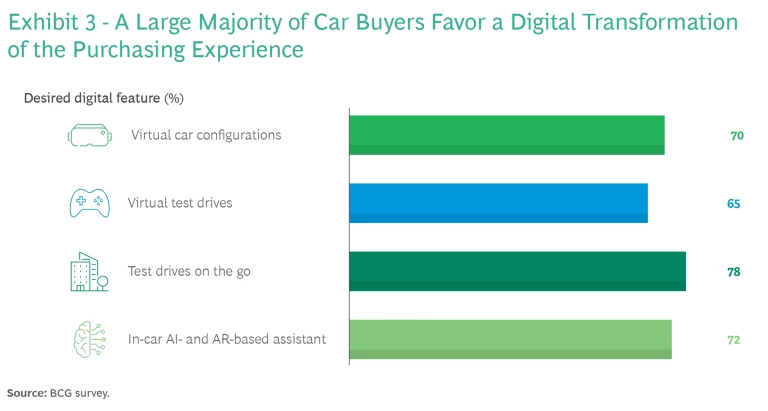 In light of today's competitive automotive market—where many vehicles share similar technical specifications, features, and performance—the overall customer experience plays a crucial role in setting OEMs apart, and there is clearly both room and a need for improvement. Just ask potential buyers. In our survey, around 70% of respondents said that they wanted new digital technologies to be a central component of purchasing a car. (See Exhibit 3.)