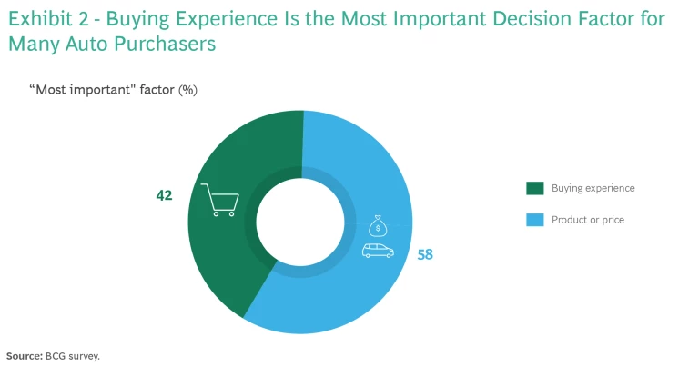 To amplify the significance of this frustration, 42% of respondents said that customer experience is the most important element in their car purchasing decision. (See Exhibit 2.) If the customer experience is negative, it can outweigh other considerations—such as brand, price, and performance—that OEMs invest heavily in.
