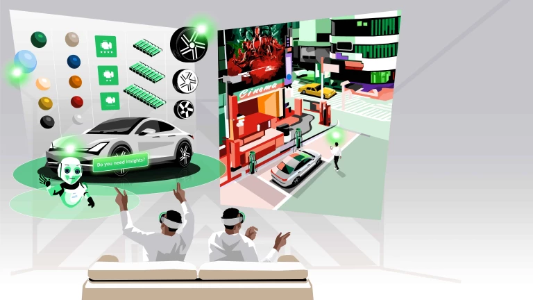 One intriguing example involves what we call a pop-up store in the customer’s living room. With this approach, OEMs employ VR to create a digital showroom in customers’ homes, enabling customers to configure colors, interiors, accessories, and other features in real time, and to experience the car with various looks, feels, angles, and settings applied. Without leaving their homes, they can virtually test-drive cars in different terrains and conditions and enjoy a highly personalized and interactive experience.