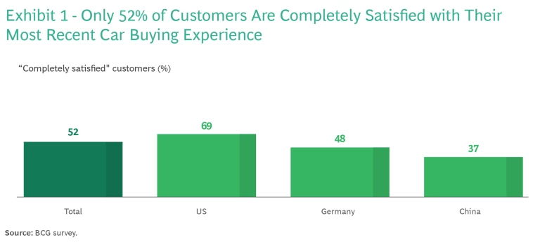 Only about half of car purchasers say that they were completely satisfied with their latest buying experience, according to a BCG survey of nearly 2,000 consumers in China, Germany, and the US who had purchased a car within the past two years. (See Exhibit 1.) Notably, in China, the percentage of completely satisfied buyers drops to 37%. Just 43% of respondents believe that their recent vehicle purchasing experience surpassed the one they had eight years prior. Moreover, survey respondents identified the critical “awareness phase”—when car buyers are inspired to buy a new car and choose the brands they favor—as the most disappointing part of the experience, fully satisfying the expectations of only 34% of customers overall and 20% of customers in the Chinese market.