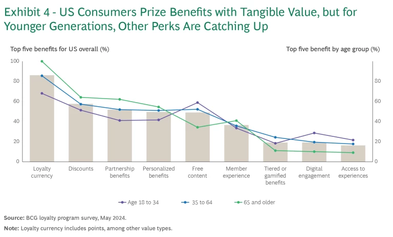 Age groups and income levels have different preferences. Everyone, regardless of age, wants rewards or benefits with tangible value—but to varying degrees. In the US, for example, consumers ages 18 to 34 are more drawn to free content and media, personalized benefits, and digital engagement through social and mobile channels. By contrast, those who are 35 and older are more interested in benefits that offer monetary benefits. (See Exhibit 4.)