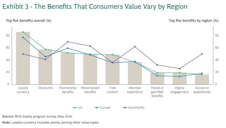 US consumers are more focused on benefits with tangible value than people in Europe or Asia-Pacific. The vast majority (85%) rank points, cash back, and promotions among the top five loyalty program benefits, compared to 75% of Europeans and 55% of Asia-Pacific consumers. They are also interested in ancillary benefits like partnership benefits, personalized benefits, and free content, preferring different offerings depending on the brand or industry.