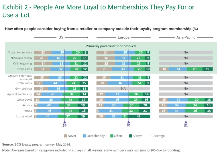 People are most loyal to paid memberships. Loyalty is strongest for paid memberships or programs. Streaming services, online gaming, credit cards, and news and media, which primarily offer paid content or products, have the highest loyalty overall. (See Exhibit 2.) Among non-paid memberships or programs, people are most loyal to grocery, pharmacy, and retail.