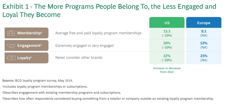 People are joining more programs but are less loyal and engaged overall. In the past two years, the number of programs the average US consumer belongs to increased by approximately 10%, to a total of more than 15. The average European belongs to nine. (See Exhibit 1.)
