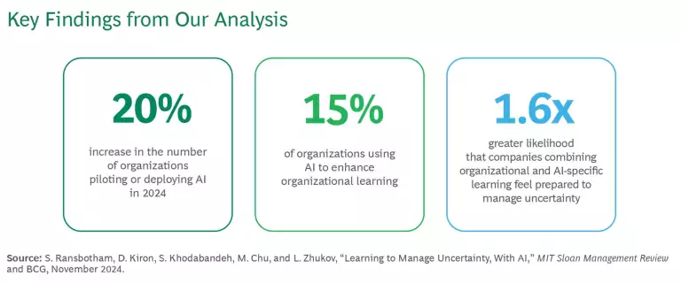 Combining strong organizational learning capabilities with AI-specific learning is more important than ever—not just for how organizations cultivate knowledge but also for how they deploy it to anticipate and respond to the unknown. Improving organizational learning outcomes makes companies better able to chart a strategic approach to uncertainty. When it comes to talent-related disruptions, for instance, our results showed that organizations that built AI into their learning practices are twice as prepared to manage talent-related disruptions than their peers and that they are 60% to 80% more likely to be effective at managing a volatile business landscape.