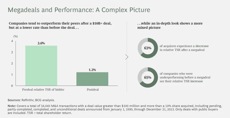 Myth #1: Megadeals usually destroy value. While that bad rap was somewhat warranted in the Barbarians at the Gate era of the 1980s and 1990s, it is no longer the case. BCG’s analysis finds that from the 2010s onward, companies that pulled off outsized acquisitions delivered outsized returns. Since 2020, the 2.9% relative TSR achieved by megadeals far exceeds the 0.5% TSR for deals valued at $1 billion to $10 billion over the same period.