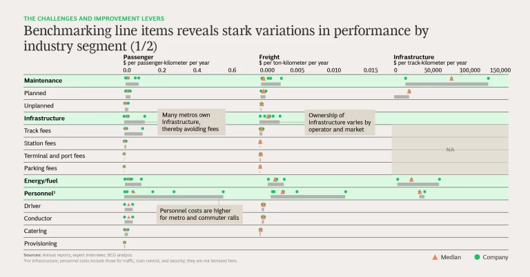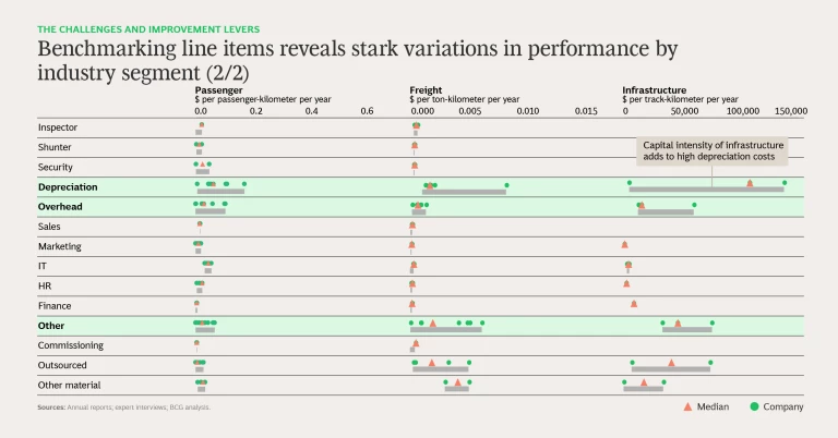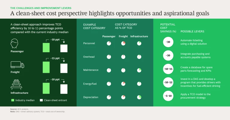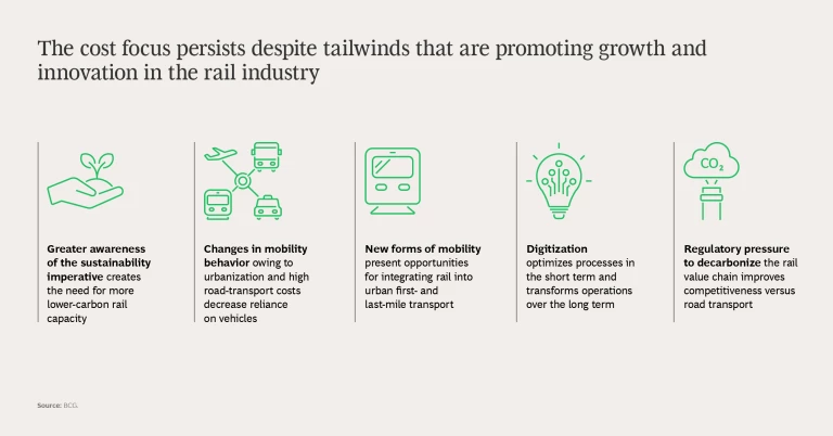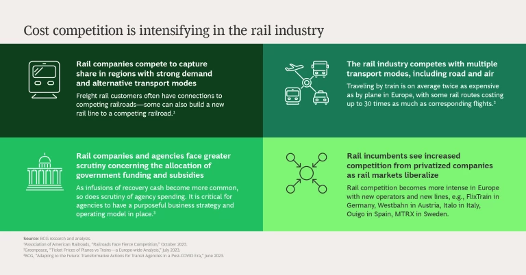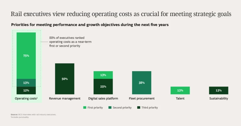 Excellence in cost management has vaulted to the top of the agenda in the rail industry. Rail companies must find ways to curb costs strategically. In recent interviews with BCG, most executives of passenger, freight, and infrastructure companies cited reducing operating costs as their top priority for achieving performance and growth objectives during the next five years.