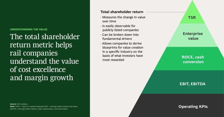 The metric total shareholder return (TSR), used by firms in many industries, could help rail companies understand the value of shrinking costs and boosting margins. TSR is an indicator of a company’s performance from an investor's perspective, gauging the effectiveness of its strategy and operations in creating value for shareholders.