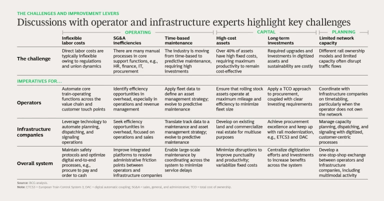 Stronger Planning and Operational Integration. Passenger and freight companies can improve punctuality and service levels by strengthening planning and operational integration with infrastructure companies. Capex reductions of 10% to 15% are possible. For example, Swiss rail operator SBB recently revised its timetables to accommodate capacity constraints arising from infrastructure renewals.