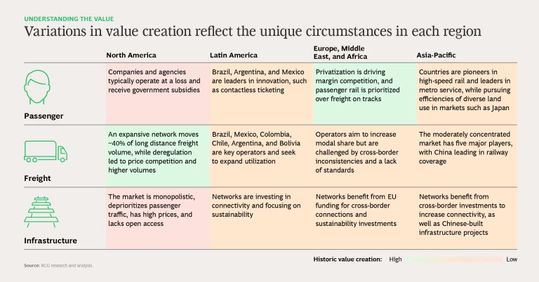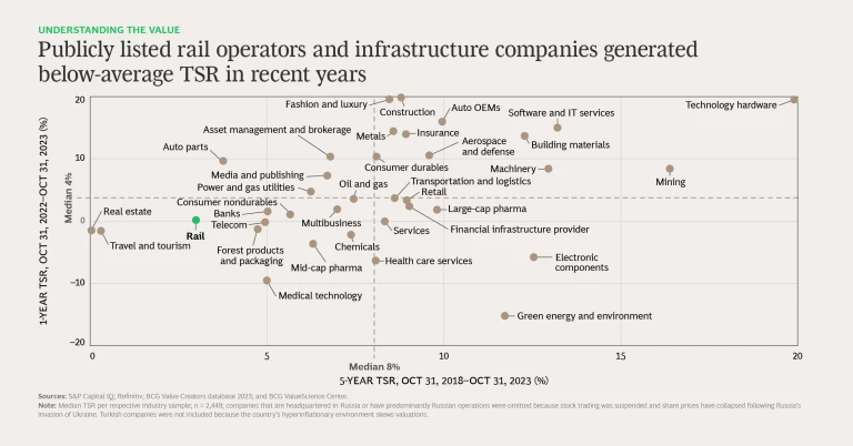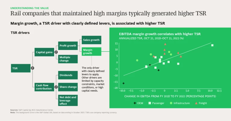 Over the past five years, the rail industry achieved a median annual TSR of 3%, compared with a median of 8% across all industries. But rail companies that successfully managed margins typically generated a higher TSR.