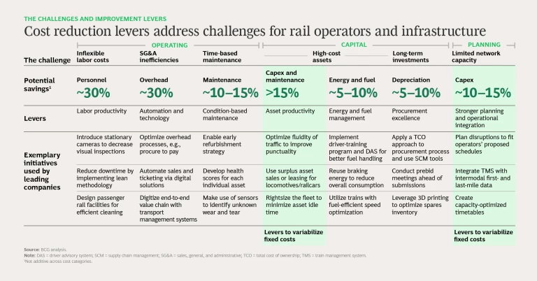 To address these challenges, leading rail companies are emphasizing a variety of cost reduction levers.