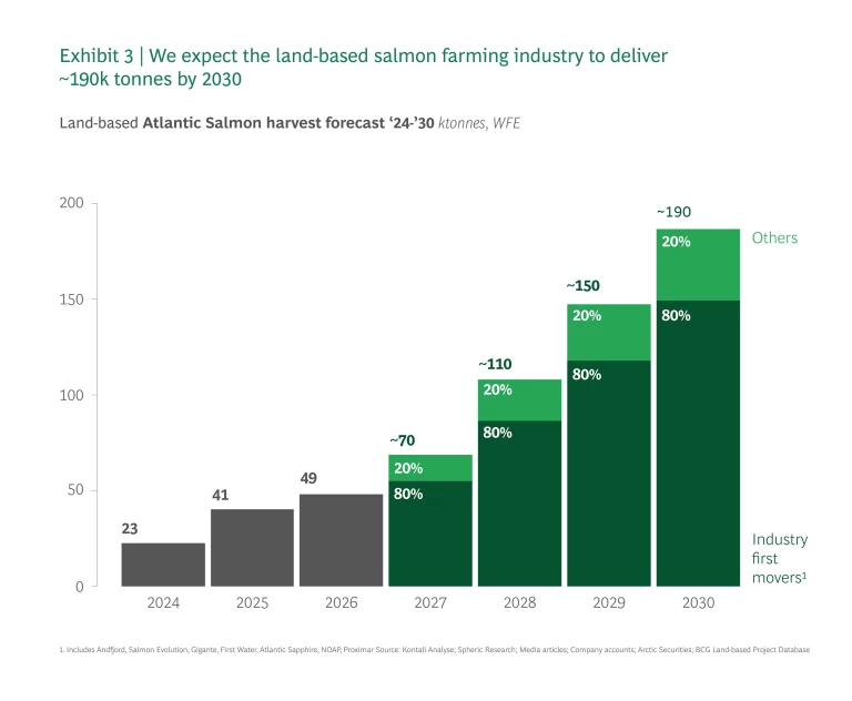 Front-runners (companies already with fish stocked or constructed underway) are expected to deliver the majority of the ~190k tonnes WFE by 2030. These players have proven their operational stability, giving them a competitive edge in scaling production.