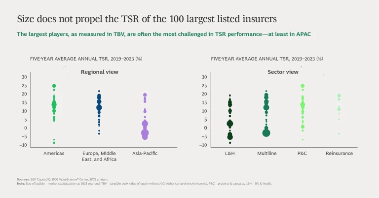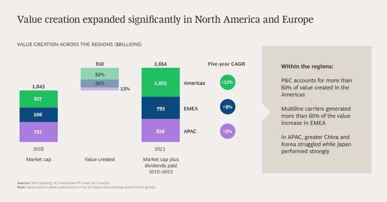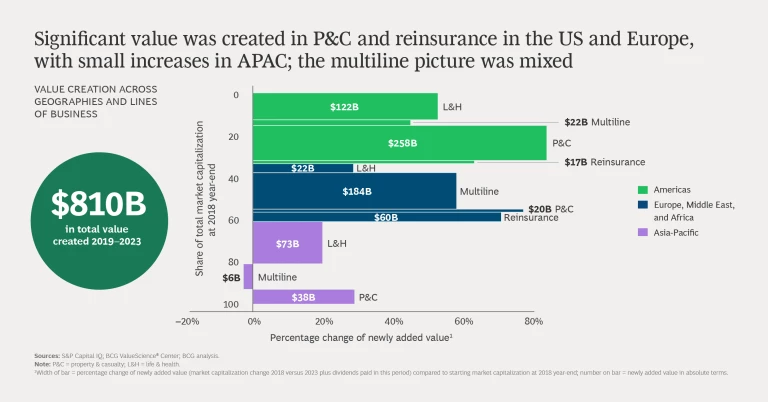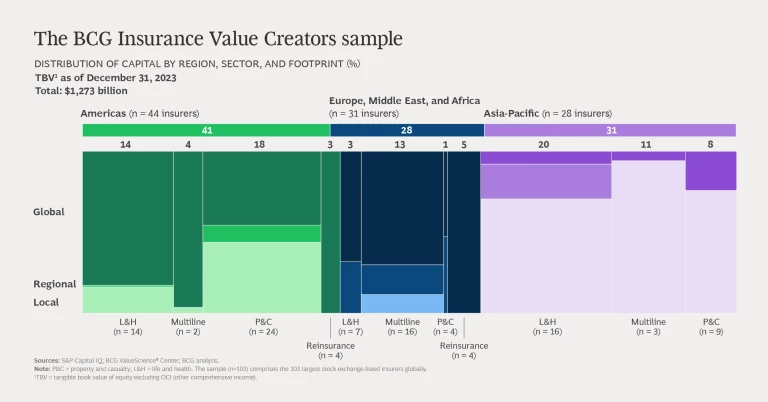 Many insurance companies operate worldwide, but outside large global lines of business (such as cyber, marine, aviation, and other global specialties as well as certain reinsurance lines) business conditions and the opportunities to create value have little in common in the three big economic regions: Europe, the Middle East and Africa (EMEA), the Americas, and Asia-Pacific (APAC). In a similar vein, the main segments of the industry—property and casualty, life and health, reinsurance, and multiline—are very different businesses that produce value in quite different ways and are measured using different sets of metrics.