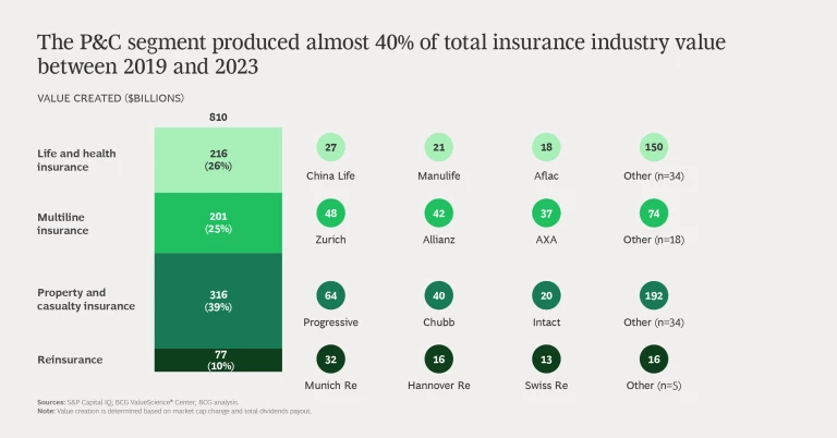 The property and casualty (P&C) segment, especially in the US, and reinsurance broadly outperformed the rest of the industry—and many other industries—on a five-year TSR basis. P&C produced almost 40% of total insurance industry value between 2019 and 2023.