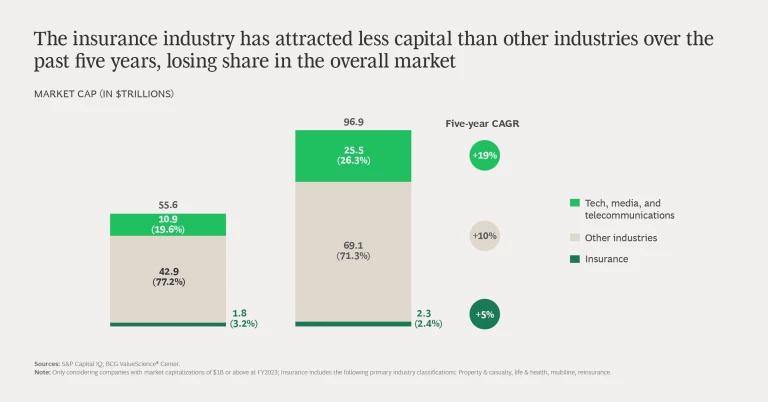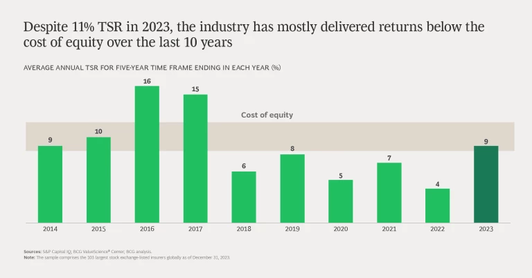 Value creation in the global insurance industry recovered somewhat in 2023, riding the back of generally rising share prices over the last year. Insurance TSR (total shareholder return) rose to 11% from 8% in 2022, but five-year (2019–2023) TSR lags most other industries, and over ten years the industry has mostly delivered returns below shareholders’ cost of equity (calculated at 8% to 11%). Not surprisingly, capital has left the industry over time. The share of investment in global capital markets of insurers worth $1 billion or more dropped to 2.4% in 2023 from 3.2% in 2018. (See “About the 2024 Insurance Industry Research.”)