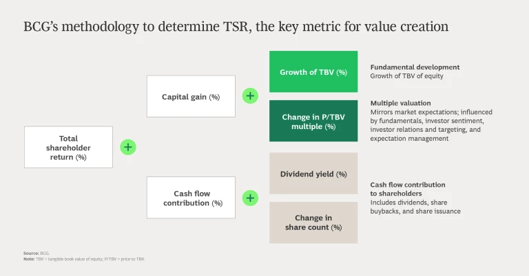 We base our analyses on data from S&P Capital IQ and Refinitiv. Given the large valuation variances in the first half of 2022 that resulted from interest rate movements, we adjusted the TBV for other comprehensive income, which we believe allows us to derive more meaningful insights into how TBV variances affect TSR over time.