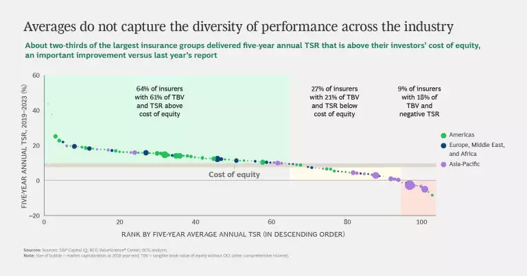 On a global basis, insurers still have a lot of work to do to improve their competitiveness with investors. But on a segment, regional, and company-specific basis, many are doing quite well, with their performance obscured by worldwide or industrywide trends. About two-thirds of insurers have generated TSR that exceeds their cost of equity, a significant improvement over last year. Top-quartile insurers generated very substantial annual returns for shareholders from 2019 through 2023—ranging from 16% to 44% and averaging 19%, well above the all-industry TSR average of 9%.
