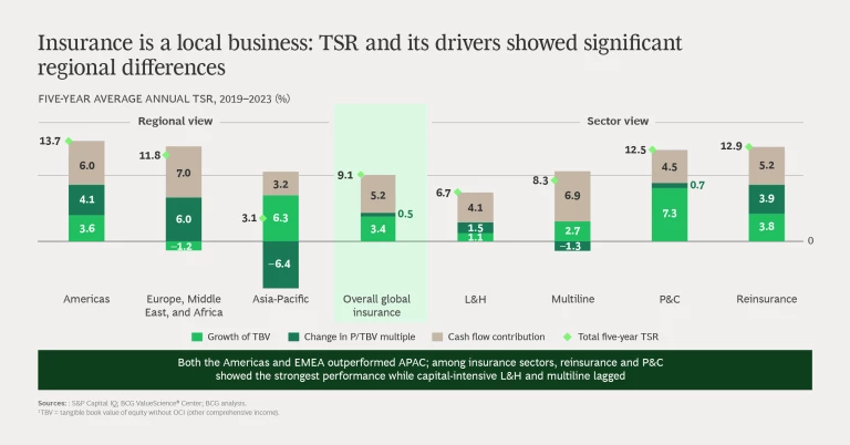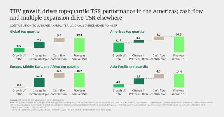 The top-quartile companies globally are well balanced: five-year annual TSR was 19.1%, of which growth in tangible book value (TBV) contributed 6%, multiple expansion 7.5%, and cash flow 5.6%. However, looking more closely at the different regions, growth was responsible for 12.8 points of the 20.7% annual TSR in the Americas, but only 0.3 points of the 18.7% TSR in Europe and 4.1 points of the 17.1% TSR in APAC.