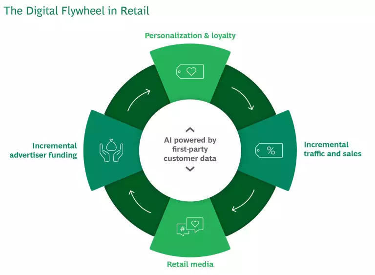 Building on these trends, leading retailers are rapidly building a digital flywheel that spans personalization, loyalty, and now also includes an advertising business fueled by first-party data. (See exhibit.)