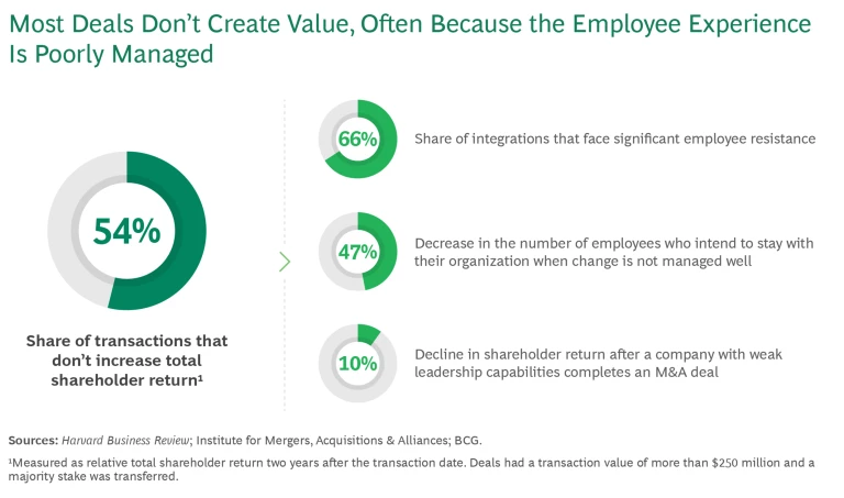 The stakes are high. BCG’s analysis found that more than half of transactions fail to increase total shareholder return. (See the exhibit.) Poor management of the employee experience is often a major contributor to disappointing performance. Two-thirds of mergers face significant employee resistance, and the number of employees who intend to stay with their organization drops by nearly 50% when change is poorly managed. The reason is clear: Integrations are stressful and highly disruptive for employees. When change is not managed effectively, morale plummets and key personnel often depart for new opportunities.