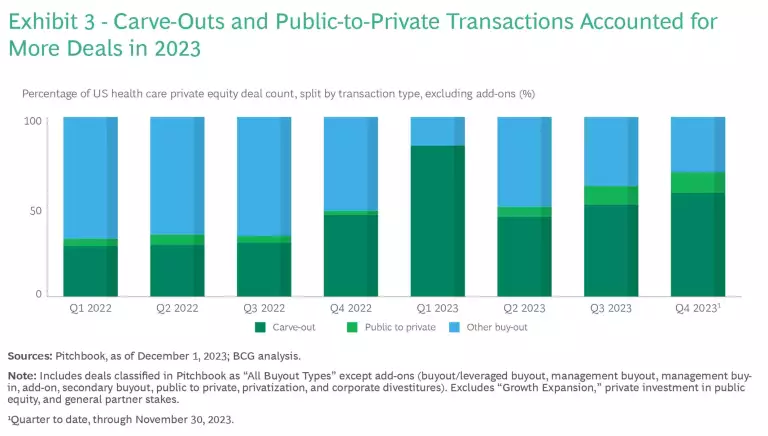 More normal trends returned to the health care sector in 2023, but mismatched valuation expectations between buyers and sellers perpetuated uncertainty, causing the deal market to remain slow. (See Exhibit 2.) A drop in private-to-private deals led to greater interest in take-private transactions and corporate carve-outs, which increased as companies doubled down on high-growth, high-margin businesses and looked to divest lower-value business lines. (See Exhibit 3.)