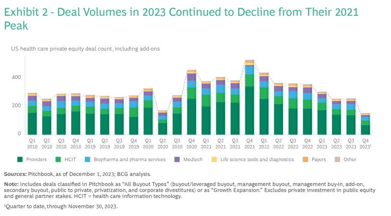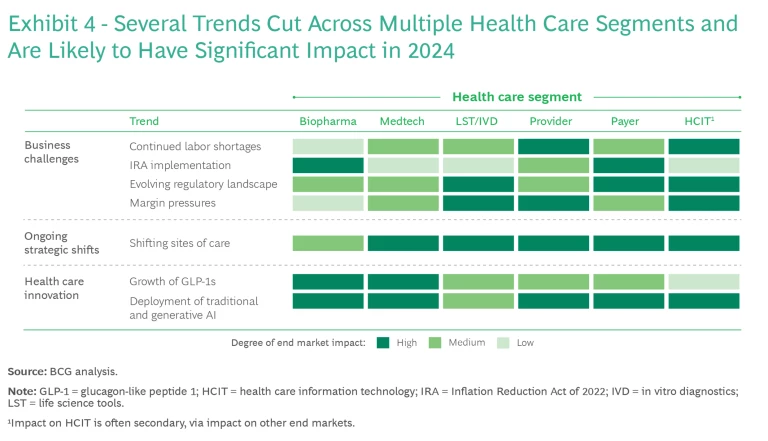 Several key challenges remain in play, including difficulties in ensuring a sufficient supply of high-quality labor, geopolitical turmoil, worrisome interest rates and inflation, and the continuation of a tight credit market. These, along with a number of health-care-specific trends, will have varying levels of impact across industry segments, which investors should keep top of mind as they formulate theses and conduct diligence on target companies in 2024. (See Exhibit 4.) Here’s a summary of the major trends.