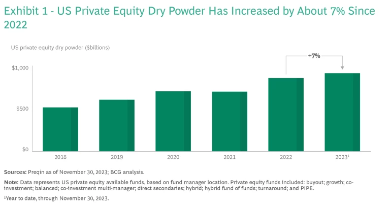 The buyer outlook remains mixed for 2024, with about 40% of investors feeling bullish about prospects for the next year, down from 50% in June. However, in BCG’s latest investor survey, 65% report an optimistic outlook over the next three years, with potential for confidence about 2024 to increase if macroeconomic conditions improve. In addition, dry powder held by US private equity investors has reached an all-time high of some $1 trillion, evidence that the capital is there to make deals happen once confidence grows. (See Exhibit 1.)