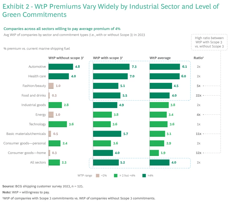 - Combined Customer Groups. When combining specific groups, such as European food and drinks customers with Scope 3 targets, the average willingness to pay reaches a premium of 11.3%—a level closer to that truly needed to decarbonize the shipping industry.