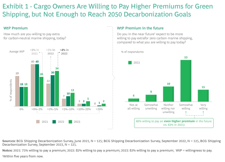 Green shipping is broadly gaining momentum, with significant developments in both the public and private sectors. The same can be said for related technologies and the development of alternative fuels. Our 2023 survey showed that more than 80% of shipping customers are prepared to pay a premium for green shipping, with the average premium currently at 4%—an increase of 33% from 2022 and double the rate of 2021. (See Exhibit 1.) Nonetheless, the projected growth rates still fall short of the levels required for significant decarbonization.