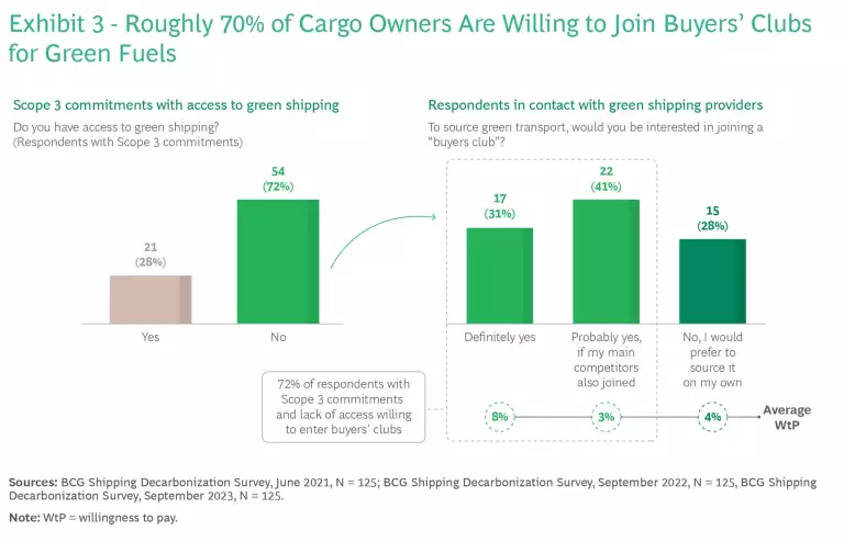 Be an early mover. The unexploited commercial opportunities in green shipping are fundamentally the result of a gap in market offerings and customer needs. Despite a clear willingness among many cargo owners—especially those with Scope 3 commitments—to pay a premium for green shipping, they often face limited access to such options. Our survey revealed that only about 35% of customers have been presented with green shipping options, with the percentage slightly higher (at around 40%) for those with Scope 3 commitments.