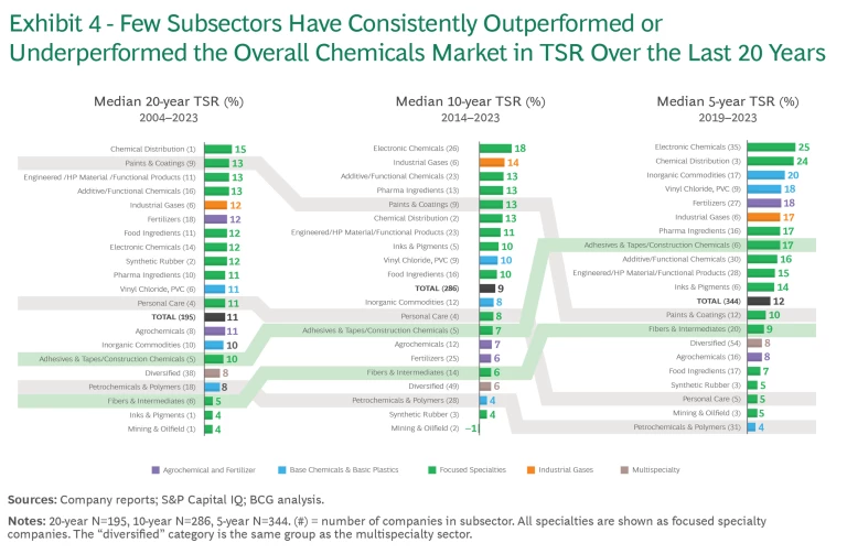 This clear distinction between winning and losing subsectors highlights the evolving dynamics within the chemical industry. It also underscores the importance of strategic focus, adaptation to market trends, and active portfolio management.
