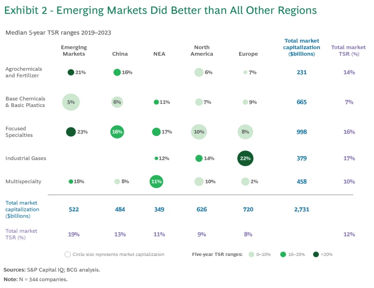 At a regional level, the global chemical industry continued to display a wide variety of TSR performances. Emerging markets delivered average five-year TSR of 19%, outperforming all other markets—which together delivered 10%—across most sectors. (See Exhibit 2.) India led the pack with TSR of 24%. Its performance was boosted by favorable demographics, robust growth in chemicals demand (starting from low per-capita chemical consumption), supportive policies, and substantial infrastructure investment.