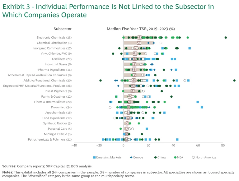 Our analysis of chemical companies within different subsectors found a wide range of individual company performances. (See Exhibit 3.) Notably, we found no direct correlation between the performance of a subsector—for example, chemical distribution, electronic chemicals, and inks and pigments, all of which are part of the focused specialties sector—and that of the individual companies contained within it.