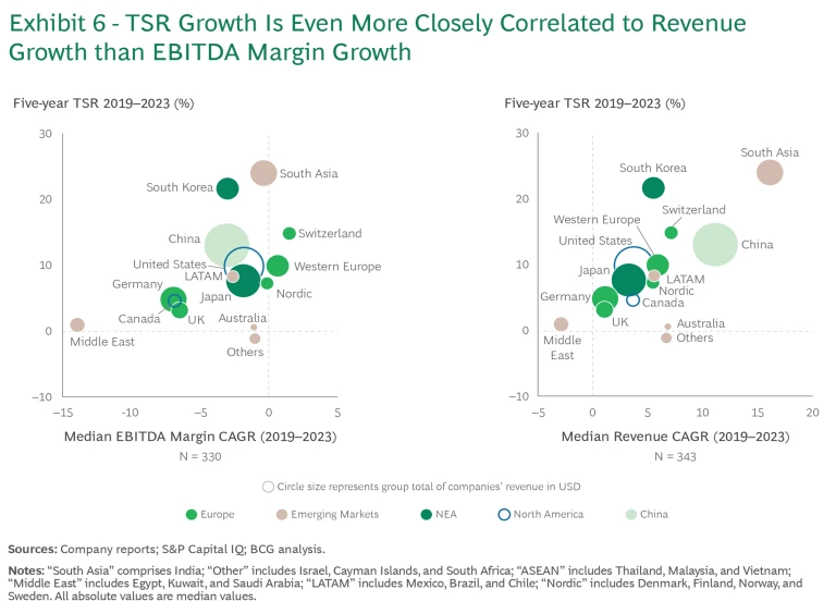 Unlike most regions, which suffered margin declines during the period 2019–2023, South Asia, led by India, was one of only a few with stable margins. The region is consistently ahead of its peer group in terms of TSR and revenue expansion, helped by generous industrial policy support from federal and state governments, a large and increasing population, and a growing middle class. Such divergence between the drivers of value creation in different regions underlines the importance of having a clear and robust TSR strategy.