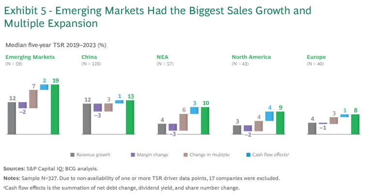 Revenue growth was the main driver of TSR performance across regions, sectors, and in subsectors such as electronic chemicals and agrochemicals. On a regional level, emerging markets (boosted by South Asia) and China were the top performers in terms of revenue growth. (See Exhibit 5.) At the same time, EBITDA margins shrank across all regions. Among our five sectors, margin declines particularly impacted multispecialty players. However, the industrial gases, mining and oilfield, and pharma ingredients subsectors benefited from strong margins. Multiple expansion—reflecting positive market sentiment about companies’ future prospects—was another important driver of TSR performance, both in emerging markets and particularly South Korea, but also in focused specialties.