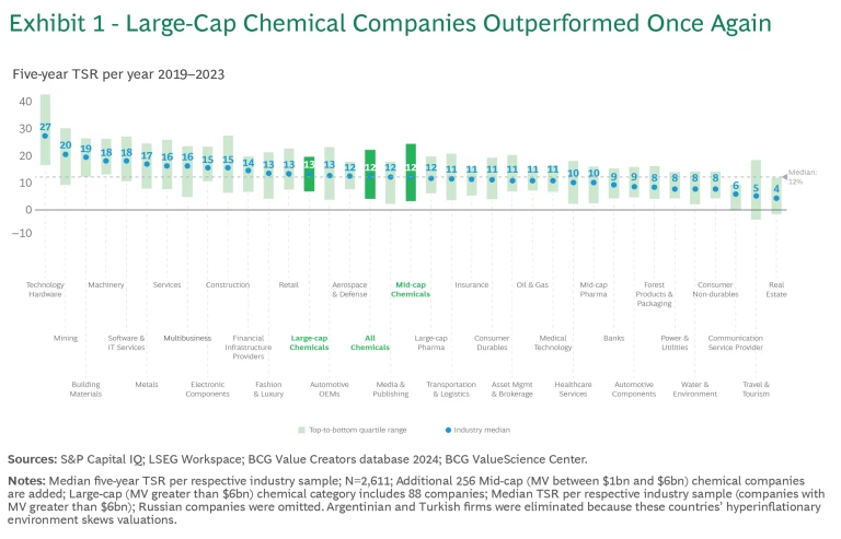 For this report, we have analyzed data from 344 publicly listed chemical companies. We have classified large-cap players as having a market value of more than $6 billion and mid-cap players having a market value of $1 billion to $6 billion. Companies typically released data for the last financial year between early and mid-2024. To calculate individual companies’ TSR, we considered the contribution of the various components that make up this metric. (See “How We Calculate and Report TSR.”)