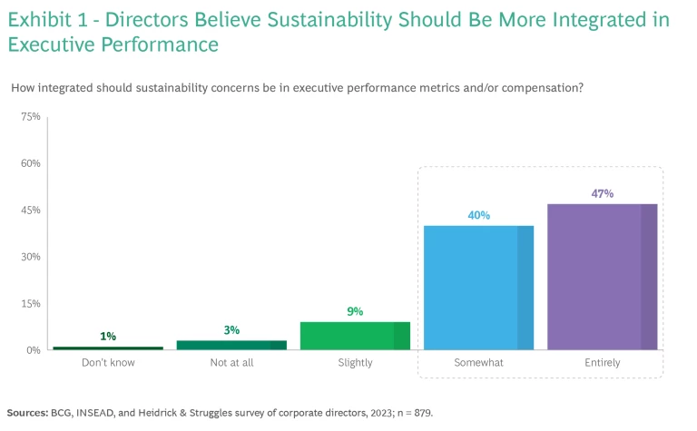 Boards and CEOs are increasingly using financial incentives to hit corporate sustainability goals. BCG research shows that 47% of corporate directors say that sustainability should be “entirely” integrated in executive performance metrics and/or compensation. And another 40% say it should be “somewhat” integrated. (See Exhibit 1.)