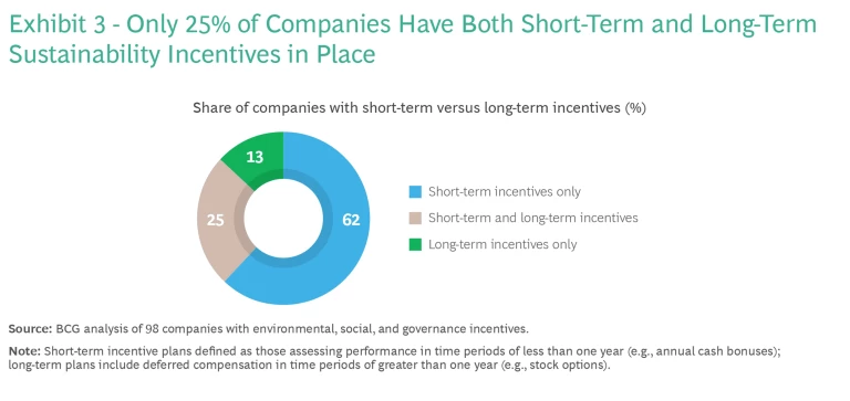 Short Timelines. In our analysis, 62% of companies incorporate sustainability goals into annual performance bonuses only, neglecting the long-term commitment required to address such a complex topic. Only 38% embed sustainability objectives into long-term incentives spanning three to five years. (See Exhibit 3.)
