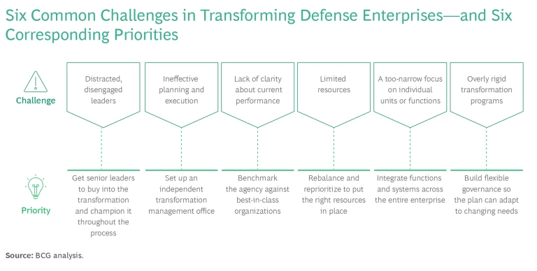 Yet with the right approach, defense agencies can overcome these challenges and launch successful transformations that leave them better equipped to fight and win in the future. Based on our extensive work helping these organizations around the world implement large and complex change efforts (this is the second article in an ongoing series about transforming defense agencies; the first discussed the core elements that leadership teams must address in a transformation), we have identified the six biggest challenges affecting defense transformations, along with a corresponding priority for each. (See the exhibit.)
