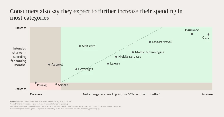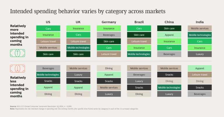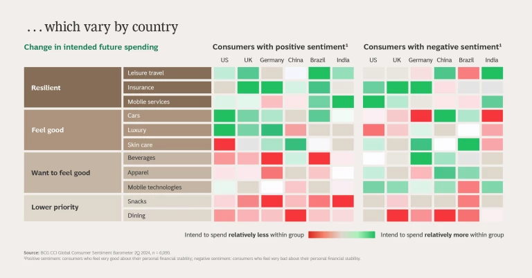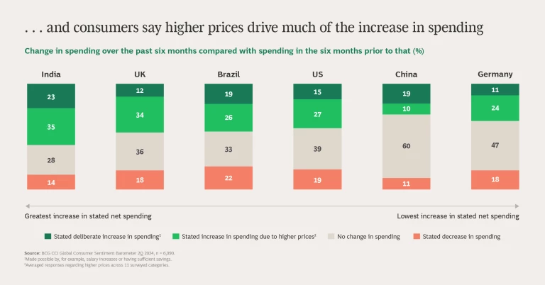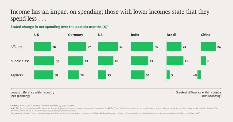 Overall, consumers say they are spending more. And they say they are planning to increase their spending even further, in particular product categories. But companies should not interpret these findings as a sure sign of returned consumer confidence. This outlook is nuanced—it reflects the impact of inflation. That is, in countries where inflation is higher (for example, India and the UK), increases in spending are driven more by higher prices than by deliberate decisions to spend more. Consumers expect this trend to continue. Income plays a role as well: middle-class consumers and particularly “aspirers” (those not yet in the middle class but with the potential to move up) have less positive sentiment about their financial situation than affluent consumers.
