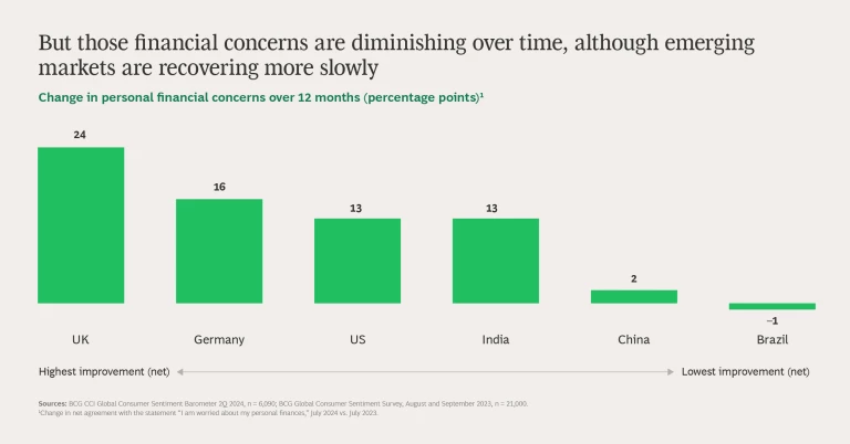 In general, emerging markets are recovering more slowly than the more mature markets we studied. Consumers in Brazil, China, and India—where the gap between high- and low-income levels is particularly pronounced—indicated that they experience greater financial constraints and feel more worried about their personal finances than did those in the UK, Germany, and US. In fact, although consumer concerns have lessened in most markets since last year, consumers in Brazil are still just as worried about their personal finances as they were then. Brazilian consumers express equal concern about the economy in general and their own economic situation.
