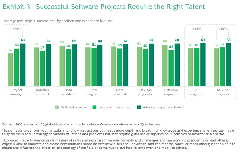 But on a more granular level, having product managers with wide ranging skills increased success rates by 30%. And the presence of specialized engineers who are experts in large-scale design and machine learning methods—among the most current sets of knowledge needed in business-based advanced IT projects—improved outcomes by 14%. (See Exhibit 3.)