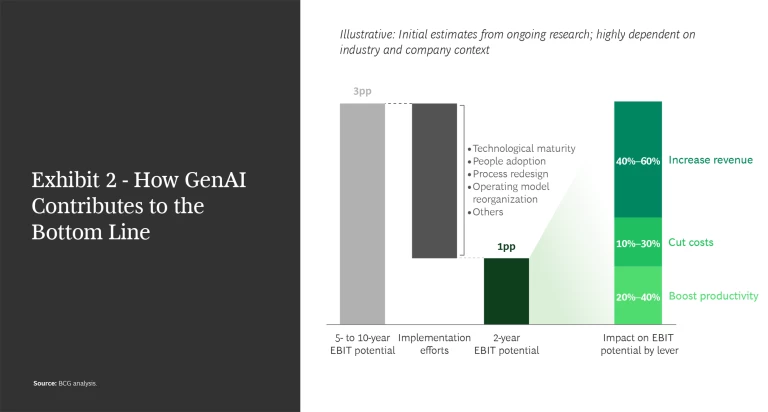 Companies have a variety of challenges to address with GenAI, and there are numerous potential strategies to convert efficiency gains to actual profit. In one recent example, BCG worked with a client to help identify 69 different process “value packages,” which are high-impact use cases with clear EBIT potential, execution milestones, and trackability. These vary from automated product management and competitor intelligence in the marketing department, to improving the accuracy and speed of decision making in the finance function. Other use cases include reassigning employees to new tasks, streamlining inventory management, and improving customer relations to drive top-line growth.