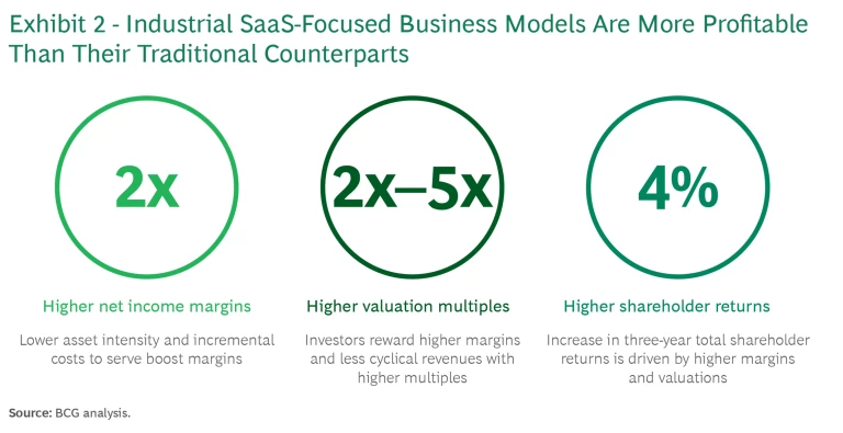 In contrast, an industrial SaaS model gives manufacturers incentives to continuously increase customer value, exerting pressure on them to align more closely with customers’ needs. Besides, customers share some of the value created with the manufacturer even as they use the product or service instead of making a single upfront payment. Because equipment failure results in lost value for both customers and manufacturers, both have an incentive to maintain machines and minimize downtime. This alignment of interests encourages manufacturers to play a bigger role in customers’ success. As a result, industrial SaaS business models catalyze faster growth, yield higher margins, and provide less-cyclical revenues, according to BCG studies.