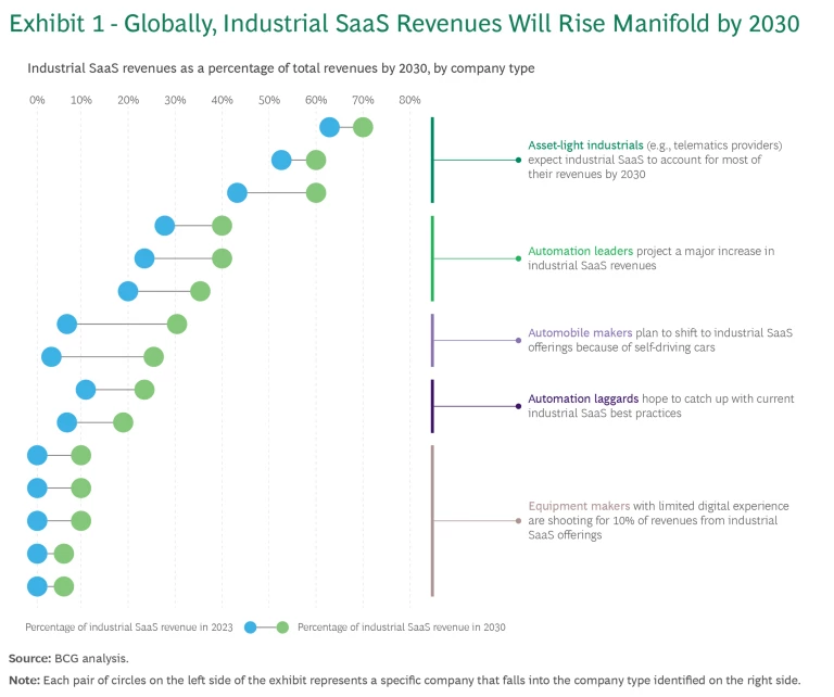 Several companies are trying to fuse the machines spawned by the Industrial Revolution with the Industrial Internet of Things (IIoT), connectivity and cloud storage, and GenAI systems enabled by the Digital Revolution to develop industrial SaaS offerings. Up to 55% of North American manufacturers plan to use industrial SaaS-based business models to grow in the near future, according to a recent survey conducted by the National Association of Manufacturers. Accordingly, they are setting ambitious industrial SaaS revenue targets for 2030. (See Exhibit 1.)