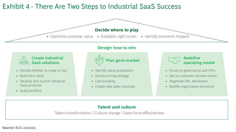 Winning industrial SaaS companies start from similar points, but they differ in how they identify value, choose offerings to develop, and execute product rollouts. Usually, however, their success or failure depends on their decisions about where to play and how to win. (See Exhibit 4.) Those two sets of decisions build on each other, generating a roadmap for creating and capturing fresh value.