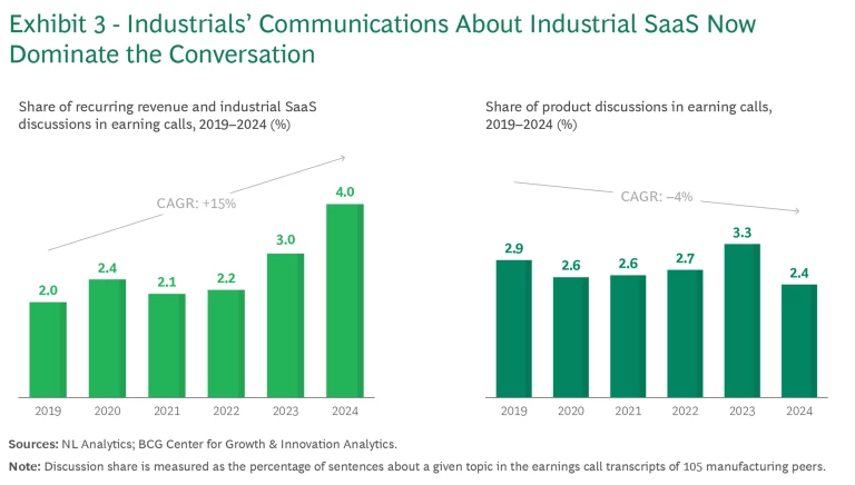 Another telltale indicator: a BCG GenAI analysis of approximately 100 industrial companies’ earnings calls in 2023 revealed a 15% growth in discussions about recurring revenues over the past five years. (See Exhibit 3.) Such conversations are now more frequent than discussions of traditional industrial hardware-related topics, which declined by 4% over the same five-year period, underscoring the value that investors now place on industrial SaaS business models.