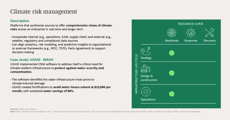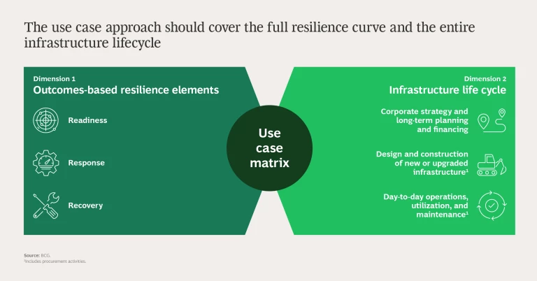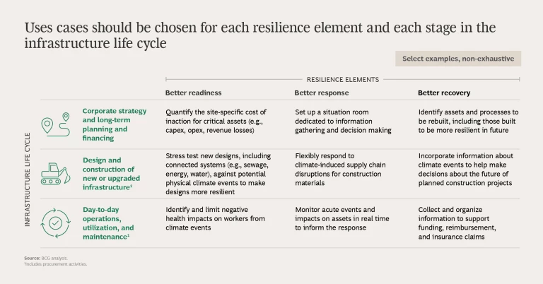 Once they have selected the leading use cases for their organization, leaders should refine and prioritize the list based on their most pressing needs, key gaps, and dependencies as well as the potential each use case offers for bolstering their resiliency. To help this process, they should conduct an internal capabilities assessment, speaking to key departments to understand where their strengths, weaknesses, and opportunities lie. For example, they could confer with their emergency management office for anything relevant to the “better response” section of the matrix in the exhibit. In addition, they could gather insights from their engineers and construction leaders about anything pertaining to “better readiness” in the design and construction phase, particularly about the materials to be used in upcoming projects.