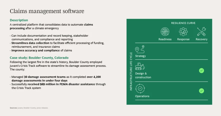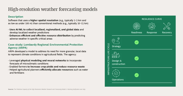 Benchmark peers. Organizations should try to understand the actions that other agencies in their field are taking to boost resilience, including unique initiatives, technology purchases, and external reports. Then, to highlight additional solutions, they should broaden this search to adjacent industries facing similar climate risks. For instance, microclimate forecasting models used in agriculture are finding applications in energy and transportation.