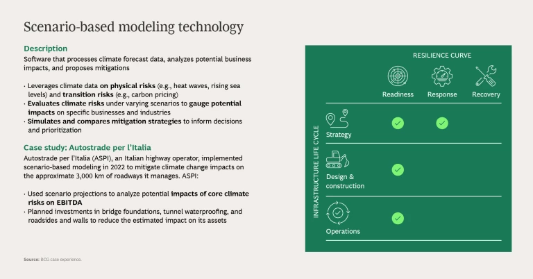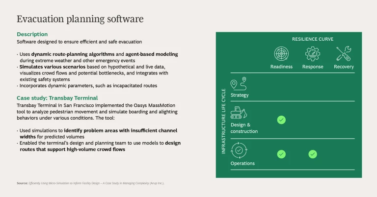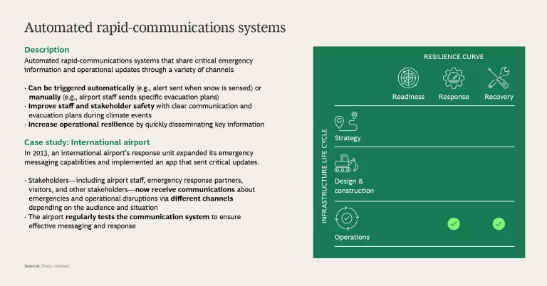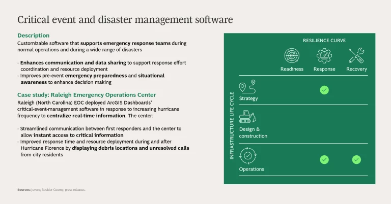 An optimal approach to A&R means proactively understanding an organization’s vulnerabilities and developing a holistic strategy for decreasing risk and enhancing resilience. This means taking into account not only physical measures, such as the building of sea walls or fire barriers, but also technology-based solutions. These should cover two dimensions: the complete “resilience curve”—from readiness and response to recovery—and the full infrastructure life cycle.
